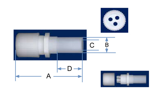 | PVDF Part No. | Tube O.D. | Ports | Orifice | A | B | C | D | Hex |