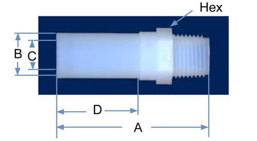 | PFA Part No. | Pipe Size | NPT Size | Orifice | A | B | C | D | HEX |