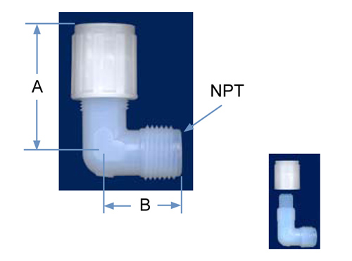 | PFA Part No. | PVDF Part No. | Tube O.D. | NPT Size | Orifice | A | B |