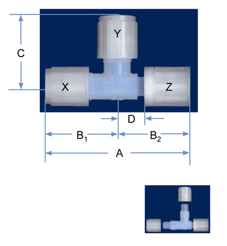 | PFA Part No. | X | Y | Z | Orifice | A | B1 | B2 | C |